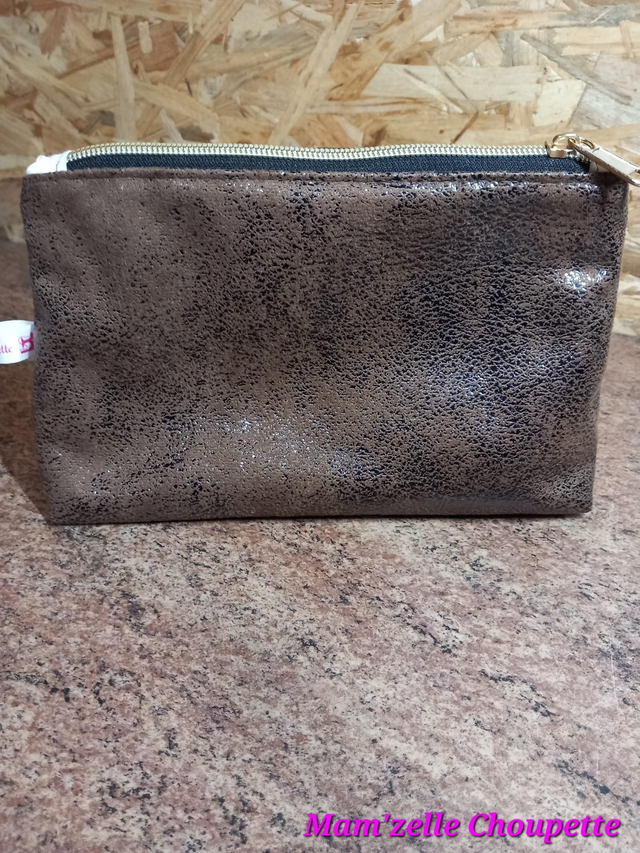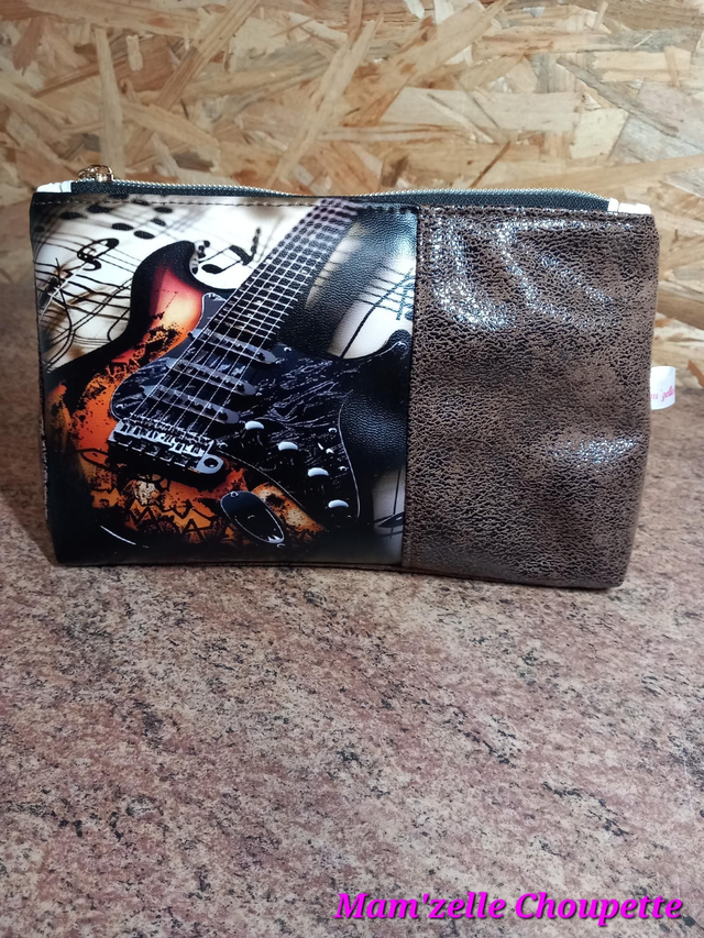 Trousse triangle grand format 22x14x6cm, peut être utilisée comme trousse à crayons, trousse de toilette, trousse à maquillage..... Réalisée en simili cuir et tissu coton. Coupon simili guitare.